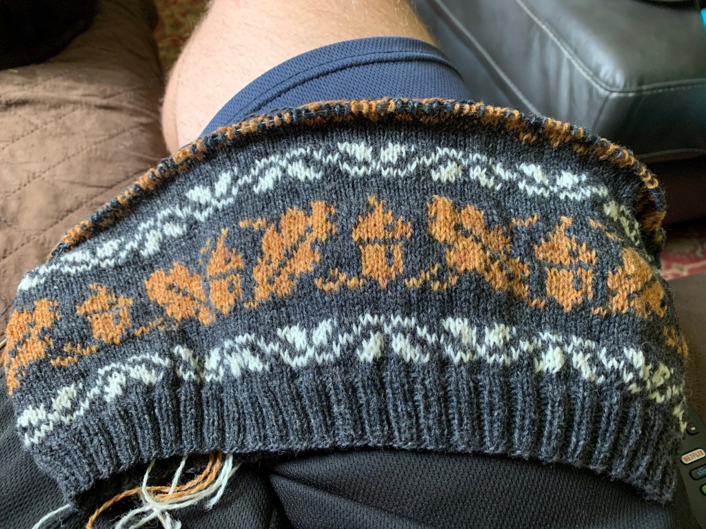 Fall is my husband’s favorite season. He loves the changing colors on all of the trees, the chilly evenings wrapped in a blanket on the couch, the hot mug of coffee in the morning to warm your hands. Last summer I had planned to knit him a fall-themed cowl, but it never came to fruition. We were deep in the tumult of home repairs, packing, and preparing to put our house on the market. We sold our house and moved into a rental in October and spent the rest of the year living out of boxes; there wasn’t much time to relax, decorate and enjoy the season. I didn’t want to miss the opportunity to knit him this cowl for a second year, so I cast on at the beginning of August to give myself plenty of time to finish.