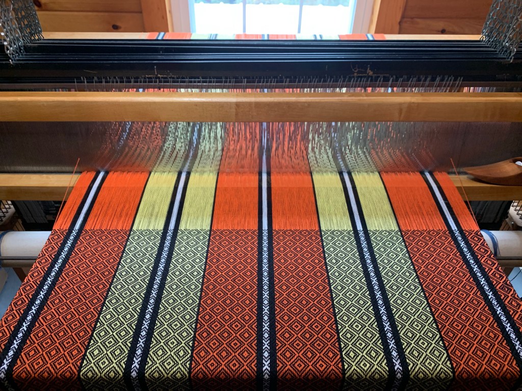 In one of the cowl photos above, you may have also noticed a stack of towels sitting on the table. I am incapable of focusing on just one craft at a time and my weaving projects are reflecting the changing seasons, too. I just took a run of 10 fall-themed towels off the loom made out of 8/2 cotton and am excited to share more details of those towels with you. They have been washed and are on deck to be pressed and hemmed.