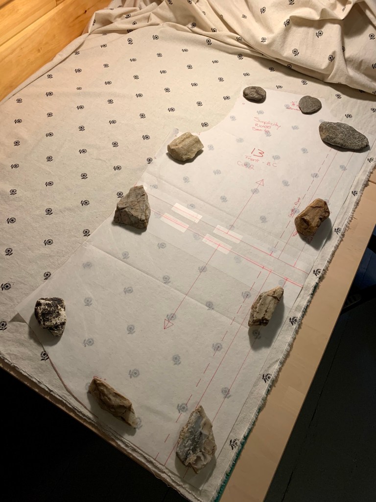 At this point I have only just cut out the pattern pieces and begun to construct the shirt, but I will share more about that project as it grows. I am really enjoying my “new” pattern weights, very graciously provided by the creek (Spring Creek) that runs along our property.