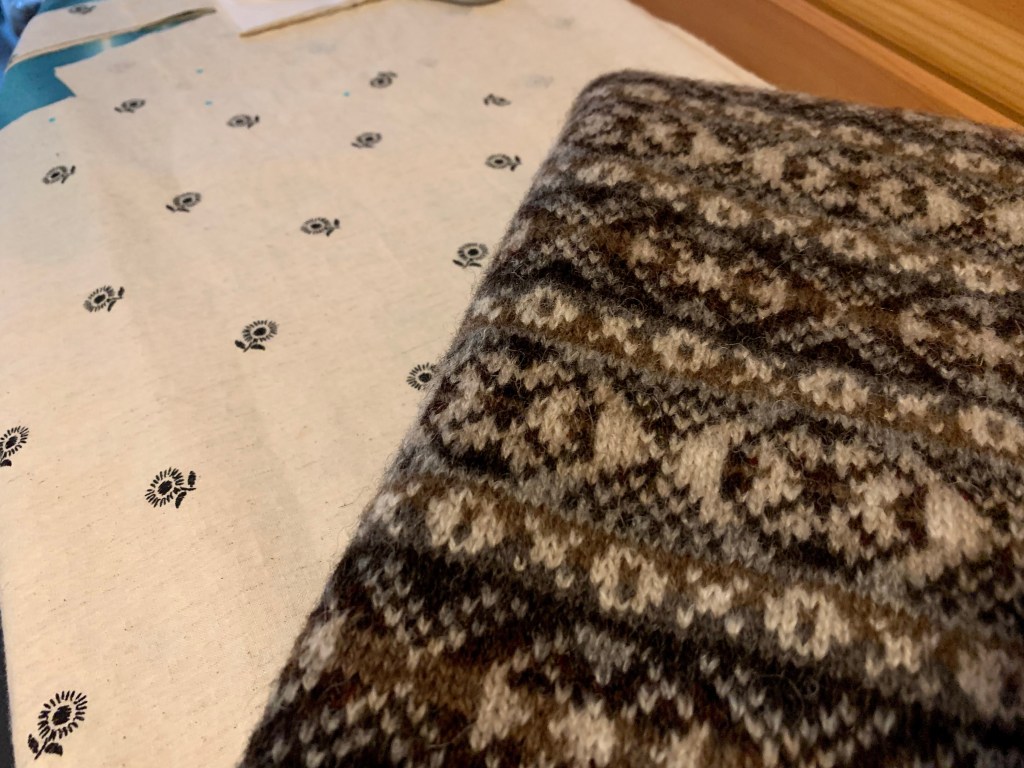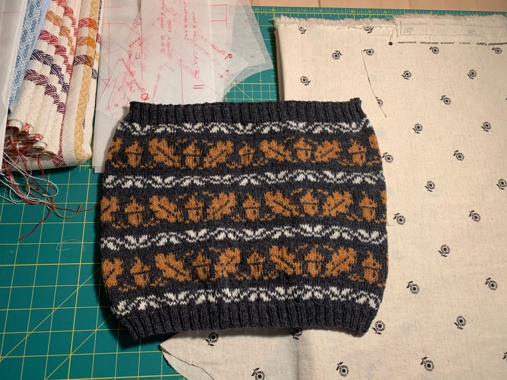 After another blocking, you can’t even tell that the dark band of large Xs and Os at the bottom was the result of reconstructive surgery. I am really pleased with the result, and the vest really does fit this time. I think it is going to pair really nicely with this oatmeal fabric that I am sewing into a button-up shirt to wear.