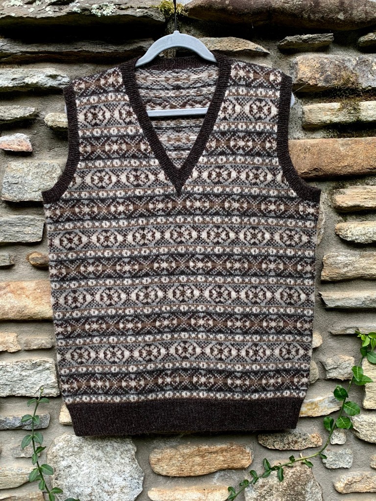 I cut open the arm holes and the neck, and I picked up stitches and completed the ribbing. I wove in all of my ends. I gave the vest a nice warm bath so it could soak and relax and bloom. I rolled it in a towel and laid it flat to dry. And then finally, I tried on my masterpiece.