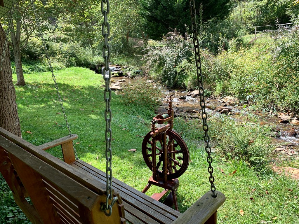 I have to admit, I haven’t spun since before moving to North Carolina, which means this project has been languishing since December. I am not a very fast spinner and I tend to get distracted by other projects, but taking my wheel outside for photos really makes me wonder why I haven’t been taking advantage of spinning by the creek. It’s the perfect spot.