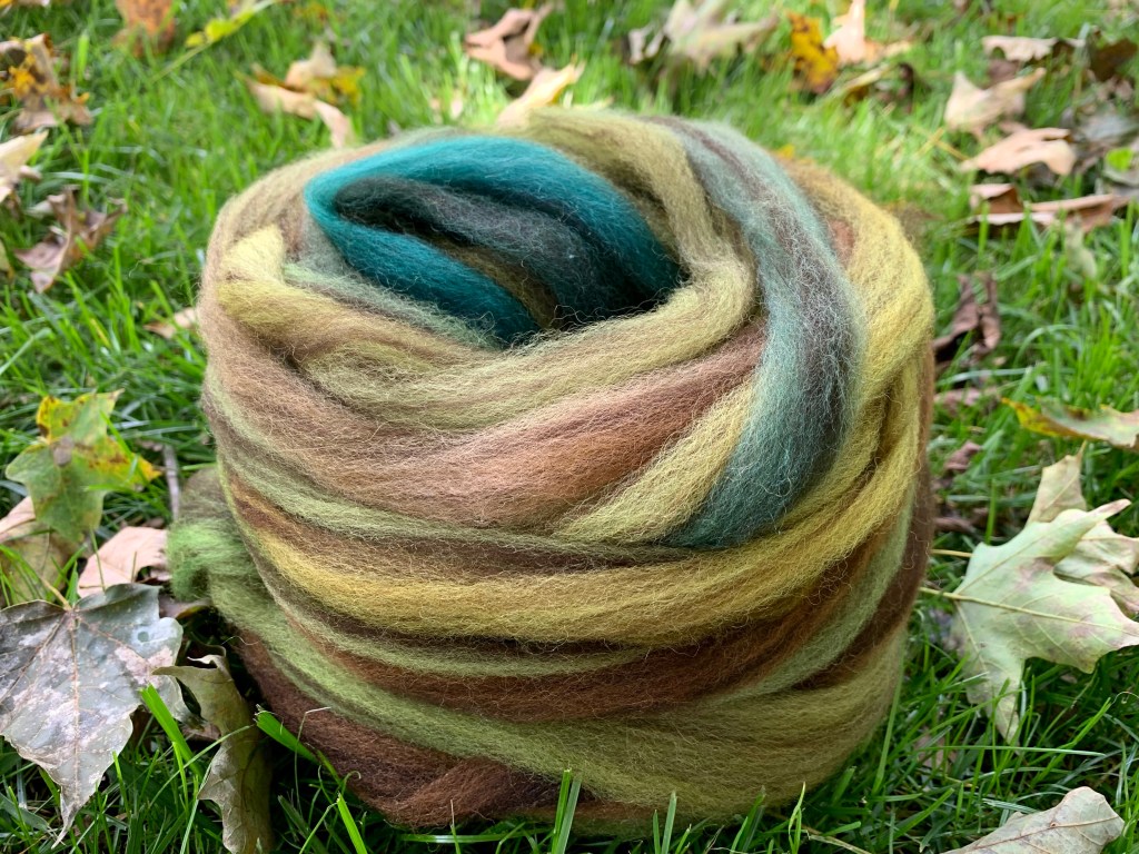 Lastly, on the wheel right now I have some beautifully dyed mixed BFL wool. I think I remember where this wool came from, but I am not 100% sure and will need to dig deep to find the label so that I can let you know. The colors are perfect for this time of year.