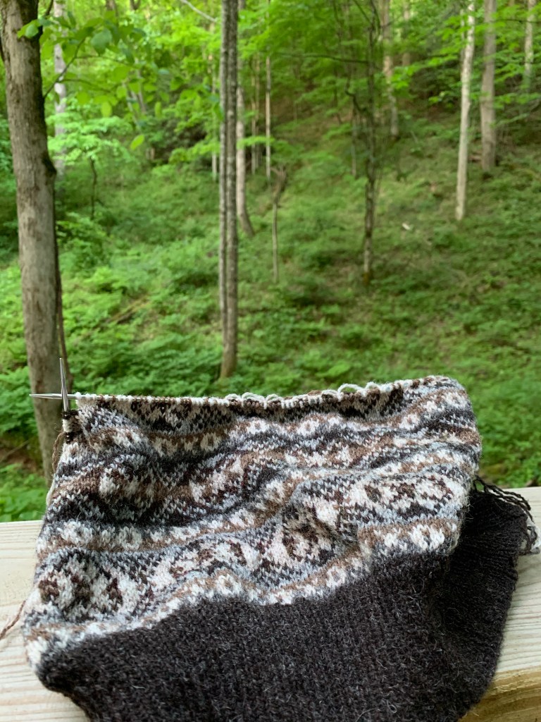 Though we’ve had chilly evenings lately, the days still warm up pretty quickly once the sun crests the mountains, but I’m sure this cowl will come in handy soon. I added an extra pattern repeat because I tend to be a slightly tighter knitting. Truth be told, I just like dense, sturdy fabric. I used the recommended needle sizes for the project (2.25mm for ribbing, 2.5mm for plain stockinette, and 3.0mm for colorwork) and assumed my gauge would have made the cowl too small as written in the pattern. It may not have been necessary to add that extra repeat, but I don’t think it did any harm other than causing me to break into a second ball of the main color for the last four rounds of ribbing. Better safe than sorry!