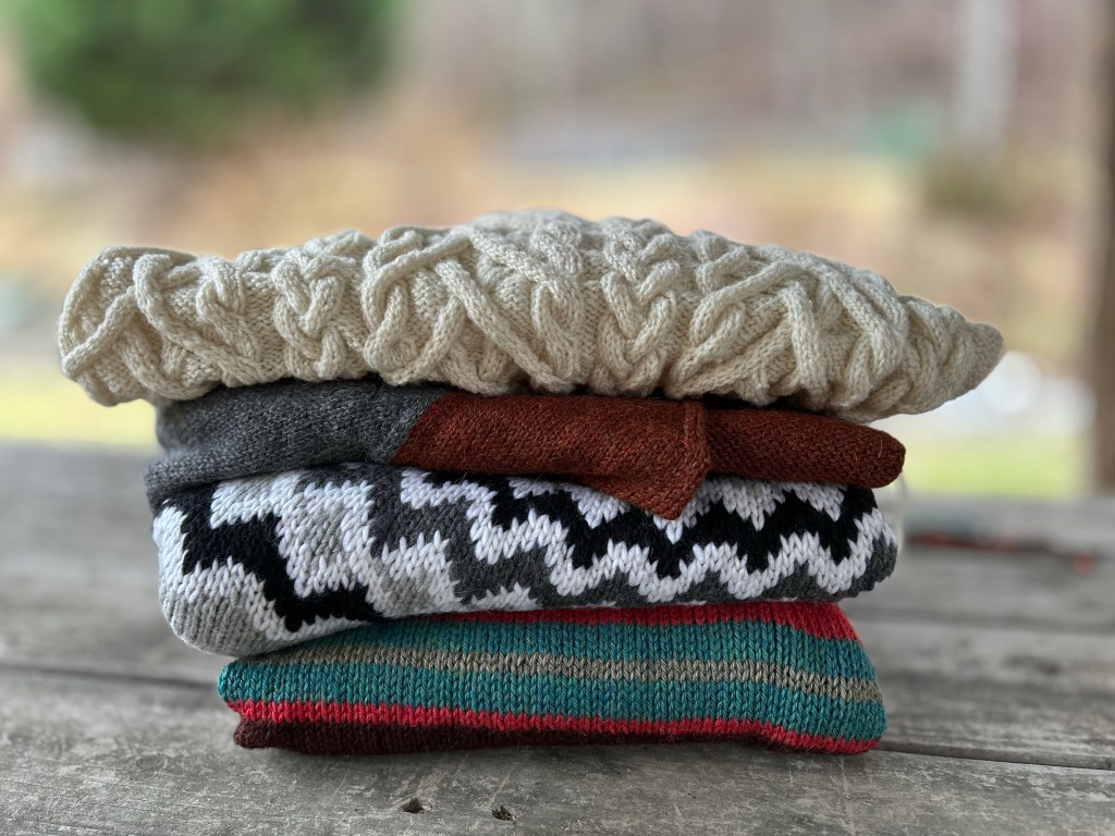 The top sweater is the most recent – I started knitting it in July 2021, and the knitting was finished by December. I just need to block it, set in the sleeves, and sew on the button band/buttons. That will literally take a week, tops. And that includes drying time.