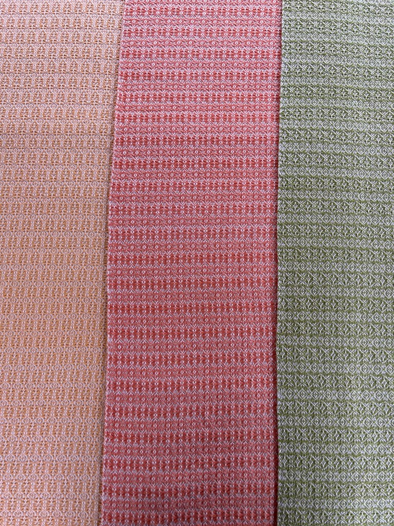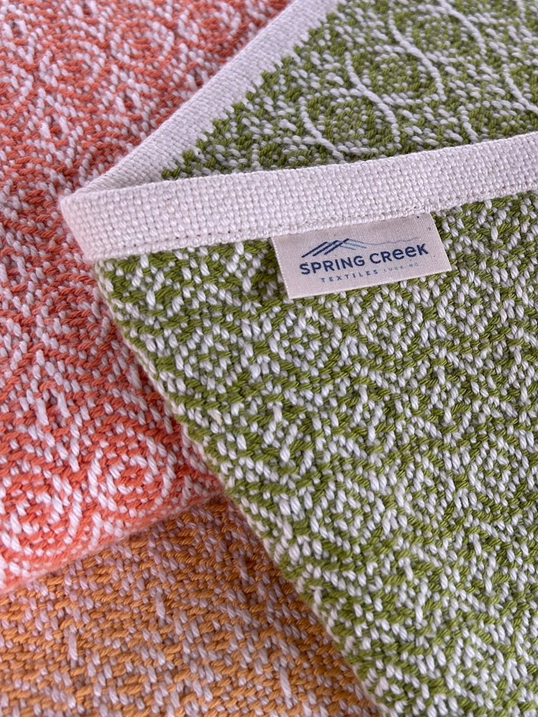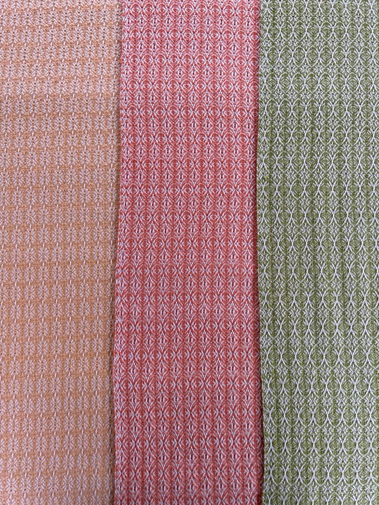 I wove each recipient a blanket and now that I have gifted two of the three, I think it is safe to share them here as well. I found an 8-shaft weaving draft that I liked on handweaving.net (#4132 for those of you with an account) and modified the treadling for each blanket so they are related, but not identical. The threading and tie up were the same for each. I used 8/4 Maurice Brassard cotton for warp and weft so these blankets would be soft and machine washable. Interestingly, after weaving these blankets and cutting them off the loom, I ended up liking the “wrong side” better than the side I had been looking at the entire time I was weaving. This is what I thought was going to be the front of each blanket: