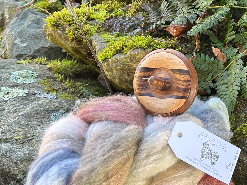 What was shocking is that I had to scroll all the way back to 2018 to find a photo of this spindle. It spins so beautifully, is well-balanced (doesn’t wobble) and is really artistically handcrafted. I was curious to find out what else Stephen Kundert had available because all of his work is stunning, and I was saddened to discover that he had passed away in 2020. I thought it was a shame that this spindle has been collecting dust for five years rather than being used, and so to honor Mr. Kundert and his art, I thought it was only right to immediately start a new spinning project with some gorgeous fiber.