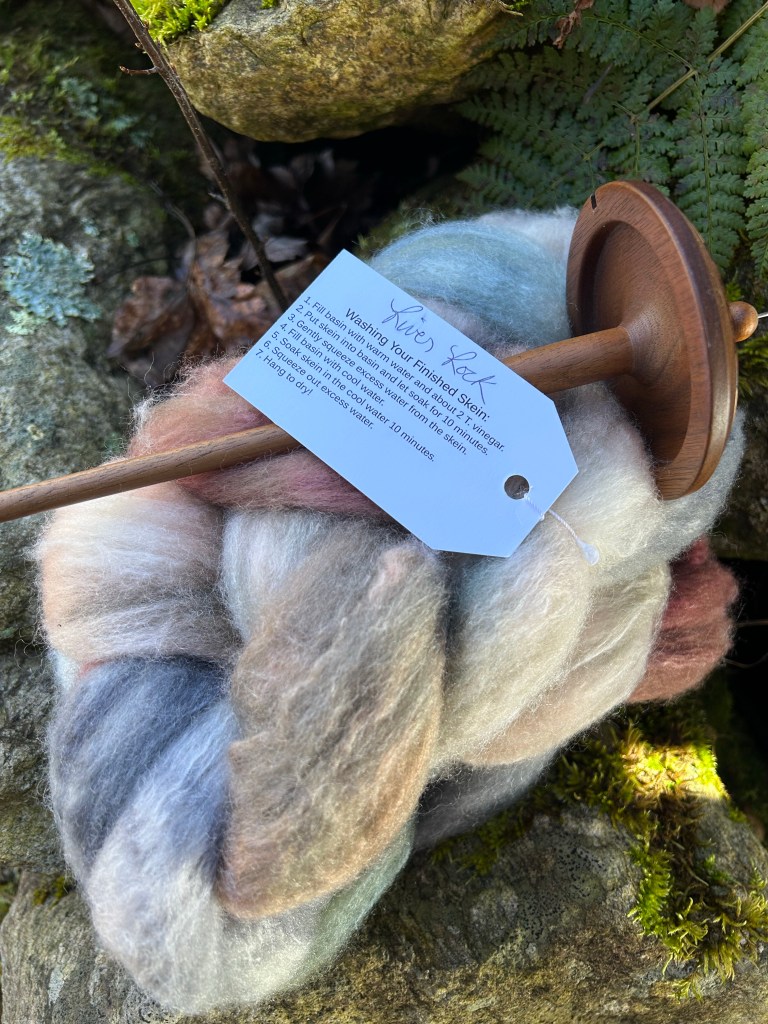 This colorway is called “River Rock”. Could it be any more perfect for me? I split this length of fiber down the middle to make two 2oz strips. I will spin two ounces on the spindle, wind it off, spin the other two ounces, and then ply those two strands together to make a 2-ply yarn. I have about 1.5 ounces spun so far and have loved every minute of it.