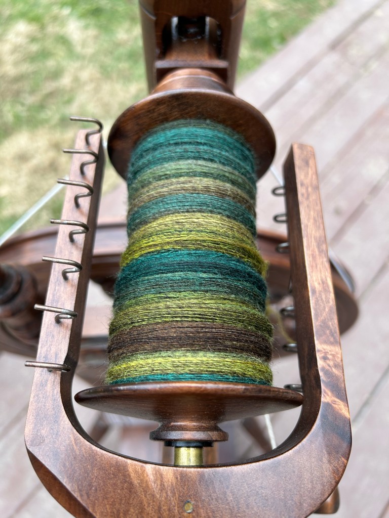 There is the additional variable here in that what I am spinning on my wheel is thinner than what is on the drop spindle, so it is taking longer to spin the same amount of wool, but I don’t think I am necessarily sold on the whole “spinning wheels are faster” idea. (Uh oh, here we go down another rabbit hole.) Drop spindles have been used for several thousand years and anybody who uses one regularly can become very proficient and productive. And many drop spindles are capable of adding twist to fiber faster than spinning wheels. My spinning wheel, a Kromski Minstrel, has a ratio of 1:16 using its smallest (fastest) whorl. That means that every time the drive wheel completes one revolution, the flyer (which adds twist to the fiber) rotates 16 times. If I treadle once every second, that equals 960 revolutions per minute. Drop spindles have been measured to spin at up to 10,000rpm. All of this to say, I think it truly comes down to personal preference, the type of spinning project you are working on (it is easier for me to spin long-draw on my wheel to produce a woolen-spun yarn), and how proficient you are at either style. I don’t consider myself proficient with either a spindle or a wheel, but am really enjoying exploring both and getting better with each project.
