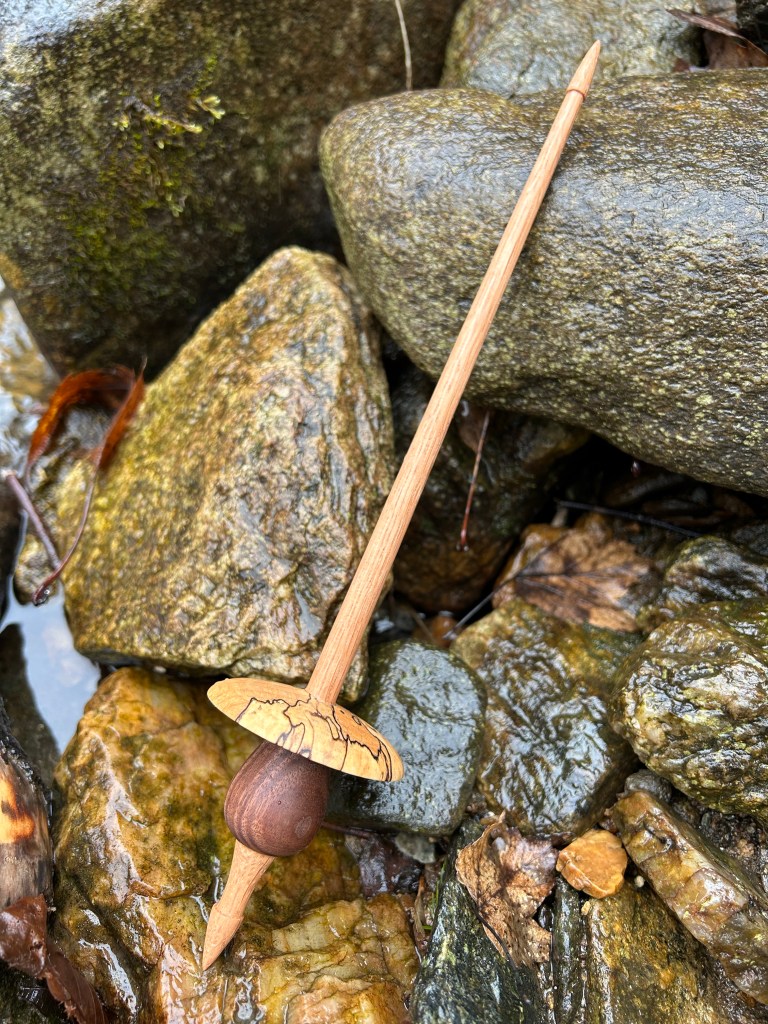 After learning that Stephen Kundert had passed away, I started searching online to see if any of his spindles were available for sale and I am telling you, I searched high and low and could not find a single spindle for sale. Not on Ebay, not on Etsy, not on Facebook marketplace, not on spinning guild websites… So to those of you who own one – keep it, cherish it, appreciate it, use it. In fact, I couldn’t find any drop spindle makers with products comparable to these Kundert spindles in their beauty and precision. If there are any enterprising woodworkers out there, this seems to be a gap in the market right now. As I fell deeper and deeper into the online rabbit hole of drop spindle woodcrafters, I did find one man in Canada who produces some really unique and beautiful drop spindles. His Etsy shop is called Viscountwoodturning and of course I had to order a few drop spindles from him.
