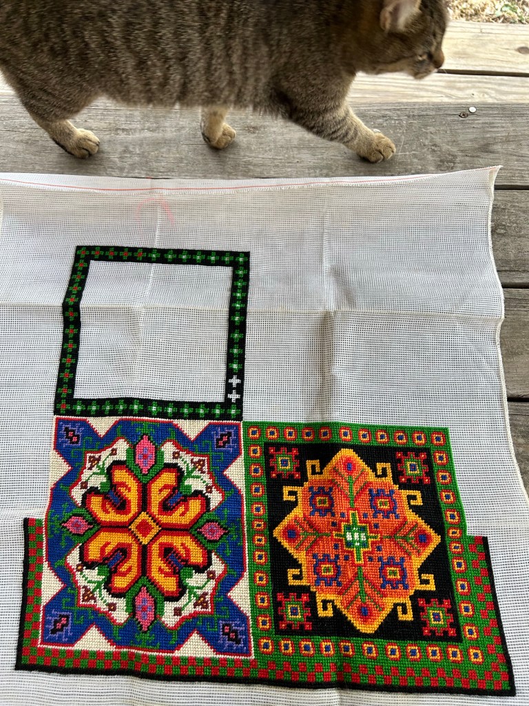 This was a kit for a pillow cover that I haven’t worked on since 2004. My mom pulled it out of her own closet and gave it to me when I was in high school. The kit itself is dated 1971. I am actually really enjoying working on this again and the colors/pattern really are very 1971. I can’t wait to watch the last two squares develop. The design is simply called “Persian Pillow”, but it has a “four seasons” vibe to me. You’ll have to let me know what you think as I continue along. To me, the two completed squares remind me of Spring and Summer, and I am working on Autumn in the top left corner now.