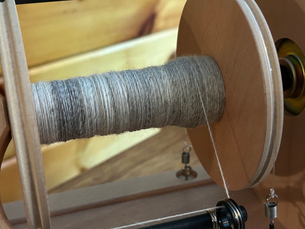 I knew I would enjoy spinning this wool, but honestly I am blown away by how nicely this is turning out especially considering how dirty and full of vegetable matter the original fleece was. I love the variation in grays here and am full of suspense to see how it plies together and looks as finished yarn. I think it is going to be beautifully heathered and I am waffling between keeping it undyed, or using this skein to experiment with natural dyeing. First things first, though, I have to finish spinning it!
