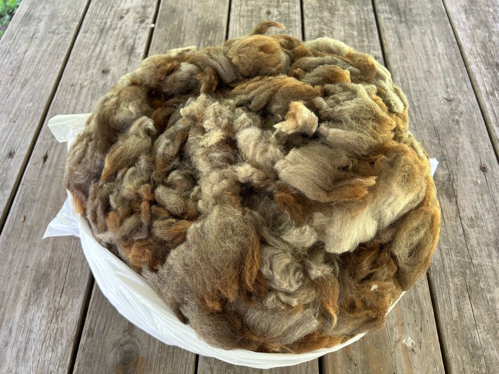 I’ve put them in storage for now until I have a mind to pull them out, open them up, and take a look at what I have to work with. I do think they may be a bit difficult to use – the fiber is on the shorter end and from what I can see there are quite a few second cuts in the fleece, but overall it is very clean and just look at that color! The natural colors of Shetland fleece just can’t be beat. But now I definitely will not be adding any more fleece to my stash until I’ve worked through some of it (at least until the Southeastern Animal Fiber Fair at the end of October. I cannot be held accountable for anything that may occur there.)