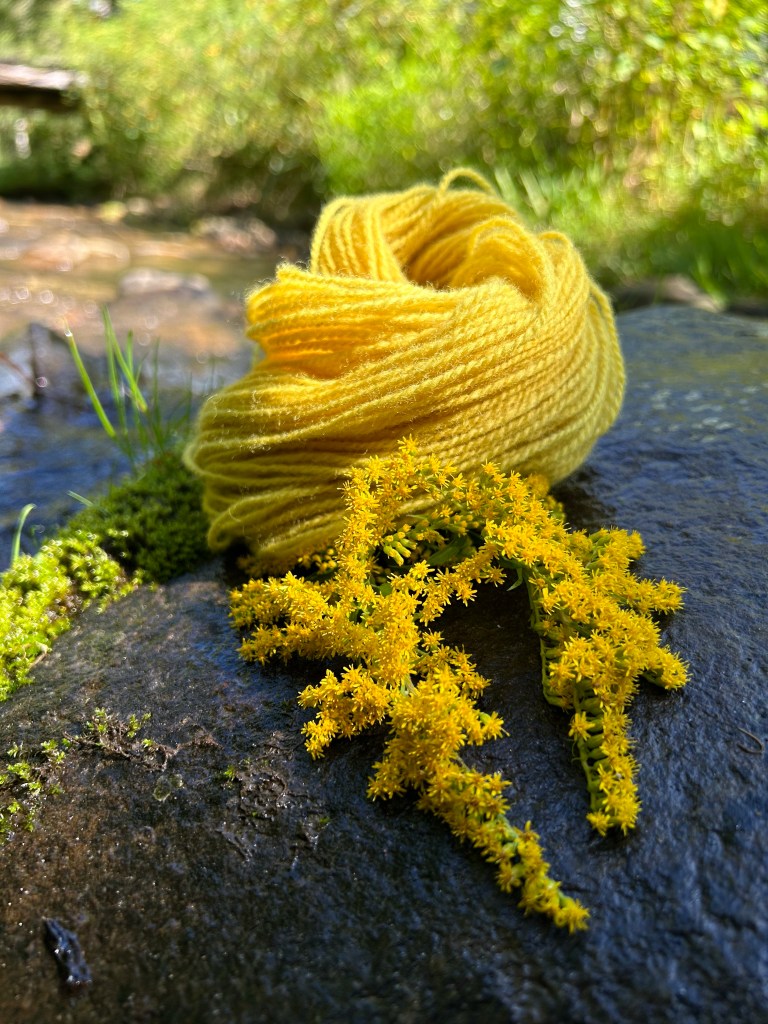 The second skein I dyed was using goldenrod, which is now in bloom. Goldenrod, like Queen Anne’s Lace, gives a nice clean yellow, but I had read that goldenrod gives a stronger color and, if simmered longer (an hour vs 20 minutes, for example) it shifts towards gold. Well Rumpelstiltskin, eat your heart out!