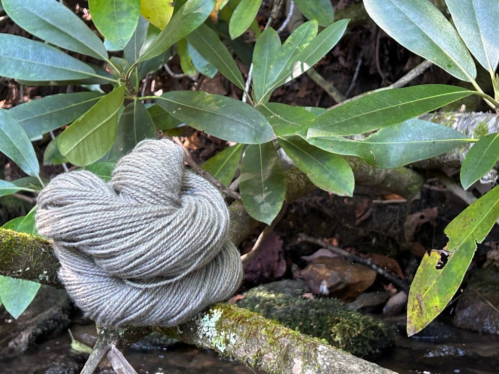 A lovely, wonderful neutral gray appeared. Now, rhododendron leaves are mildly toxic and I was careful not to breathe in any fumes as I simmered the leaves in the dye pot, but I do love this result. I suspect that there is no real dye in the leaves, but instead a fair amount of tannins, which are present in many many plants. I have since read that adding iron to tannin-rich water will give you a neutral gray, regardless of the source of tannins so I will be curious to see if I get the same result using things like acorns, or leaves from other trees. The color above is a little washed out – in person it is a bit darker, as you can see in the photo below. This skein is on the far left.