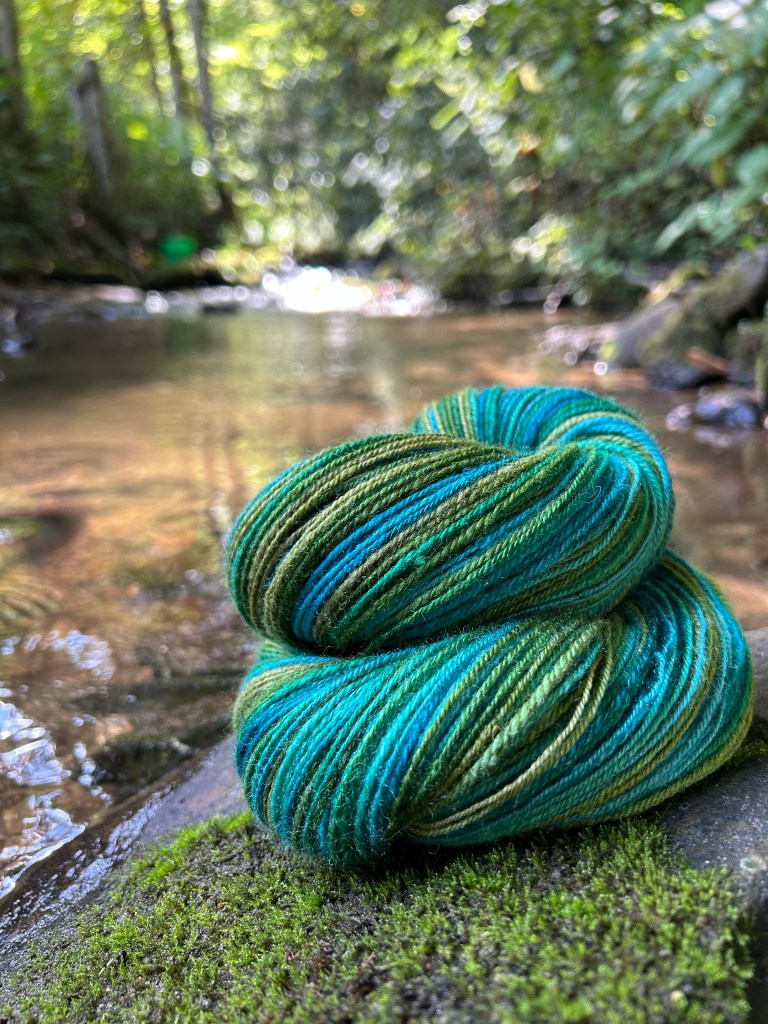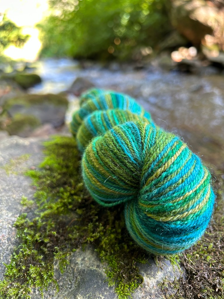 It’s hard to capture in a photo, but in person this yarn has a beautiful luster from the silk. There is so much color here that I am struggling to think of an appropriate project at the moment, but I am pleased to have another finished skein. This was 4oz. of fiber and came out to about 390 yards. I would consider this to also be around the sport-weight range. With these two skeins done, I don’t know what to spin next! I’ll have to go swimming in my fiber stash to see what speaks to me.