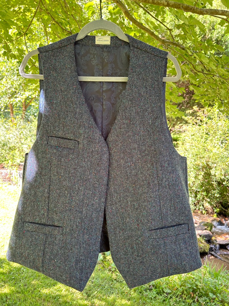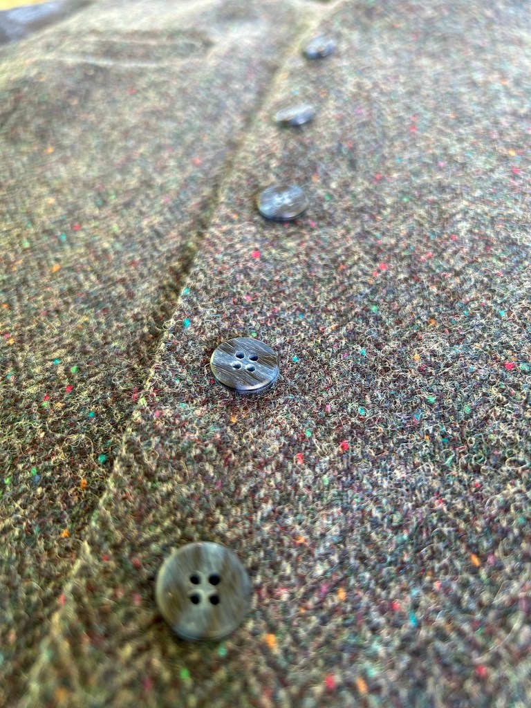 They just didn’t elevate the project in a way that a good button pairing should. So my sweet, patient and supportive husband drove me into town today for some button hunting to see what I could do. The options are Michael’s and Walmart so we’re not talking high-end button shopping here, but I think I found something that will work, even if just temporarily so that I can attend this wedding fully-dressed. I’ll share the final button choice in my next post. Now I have to bite the bullet and add some button holes and I hope I don’t mess that up too badly. What I didn’t mention about my shirt above is that I had to rip out and re-sew almost every single buttonhole at least once. I’m really hoping I don’t have to do that here as well because using a seam ripper on wool is tricky and ripping out stitches on the lining fabric is not forgiving. Wish me luck! I have a week to get the shirt and waistcoat completely finished. I have also gotten my pants situation sorted out and my wedding gift for my friend has arrived, so I’m sitting in a good spot now.