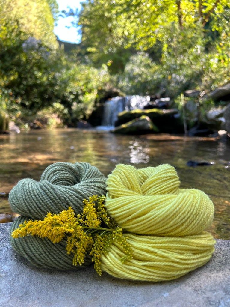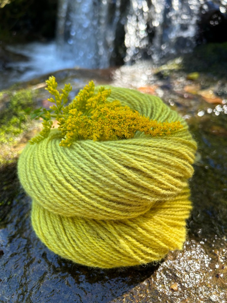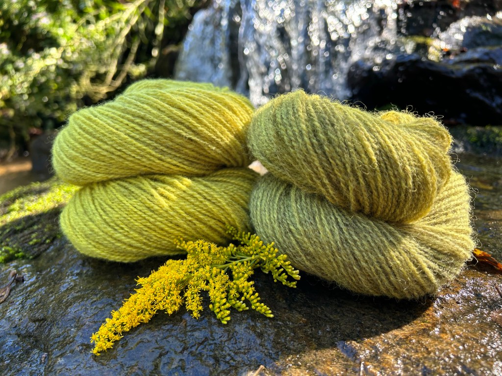 These skeins have been scoured and prepared with a mordant so they are ready to go the minute a dye plant is at its peak and ready to harvest. This is a different base yarn than I have been using, so I sampled two of these skeins to see how they take color. Both dyed together with goldenrod, I then modified one with ferrous sulfate to sadden the color.