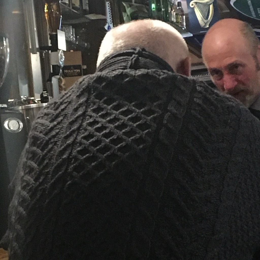 This sweater is a great companion to another that I made for Kyle, out of wool from the same vendor. Kyle wasn’t able to accompany me to Shepherd’s Harvest in 2018 because he was busy galivanting around Ireland with family. He did, however, send me this candid photo of a man in a pub with a caption “I want this sweater.”