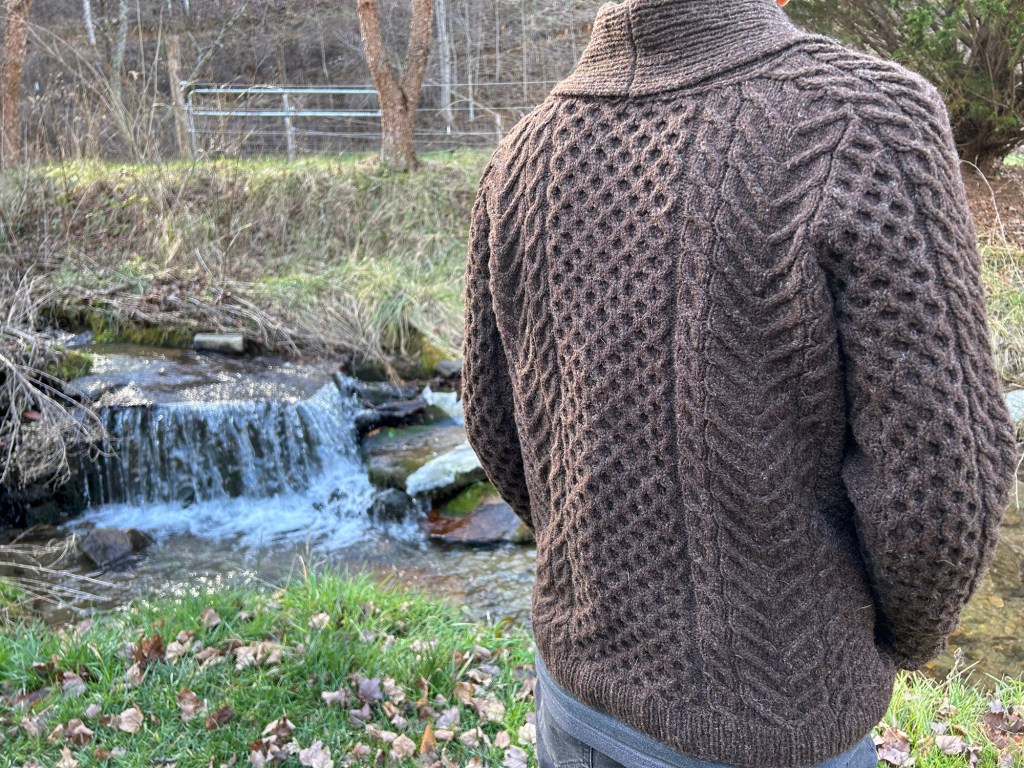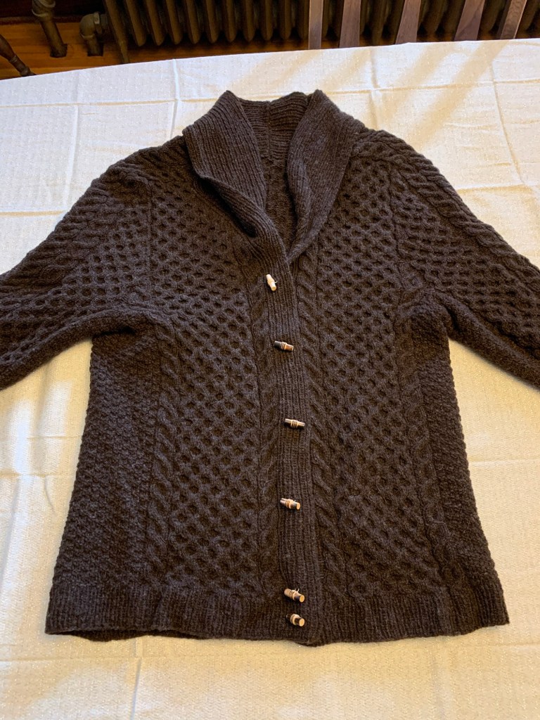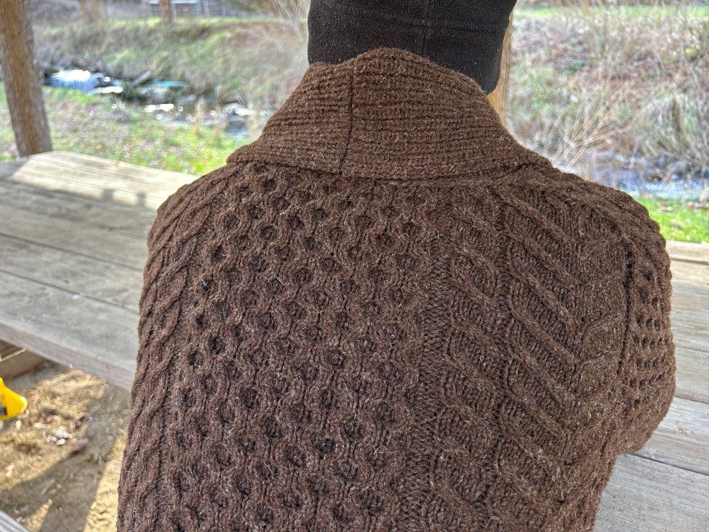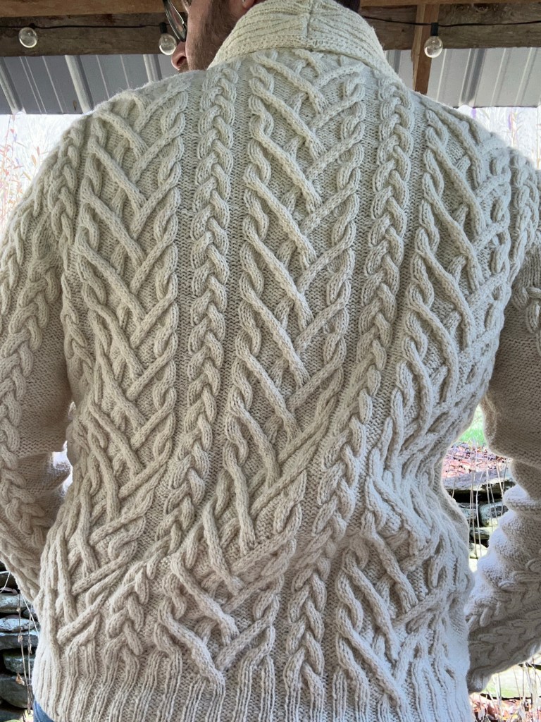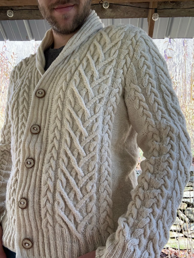 I didn’t have a lot to go off with the picture he sent, but I think I did a pretty decent job! I took some “artistic liberties”, but the cables and shawl collar I think were the most important.