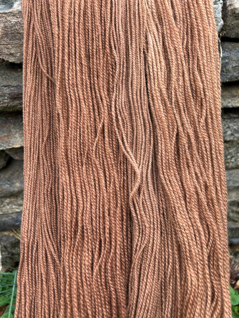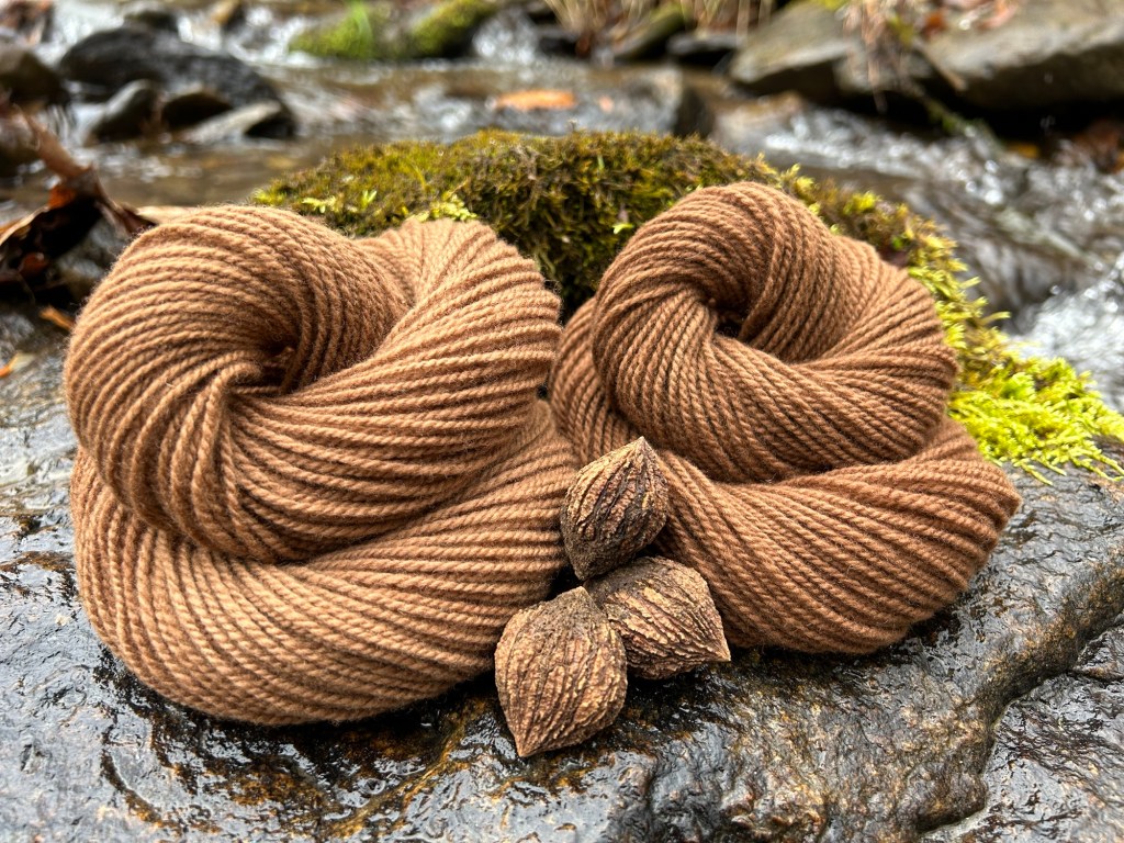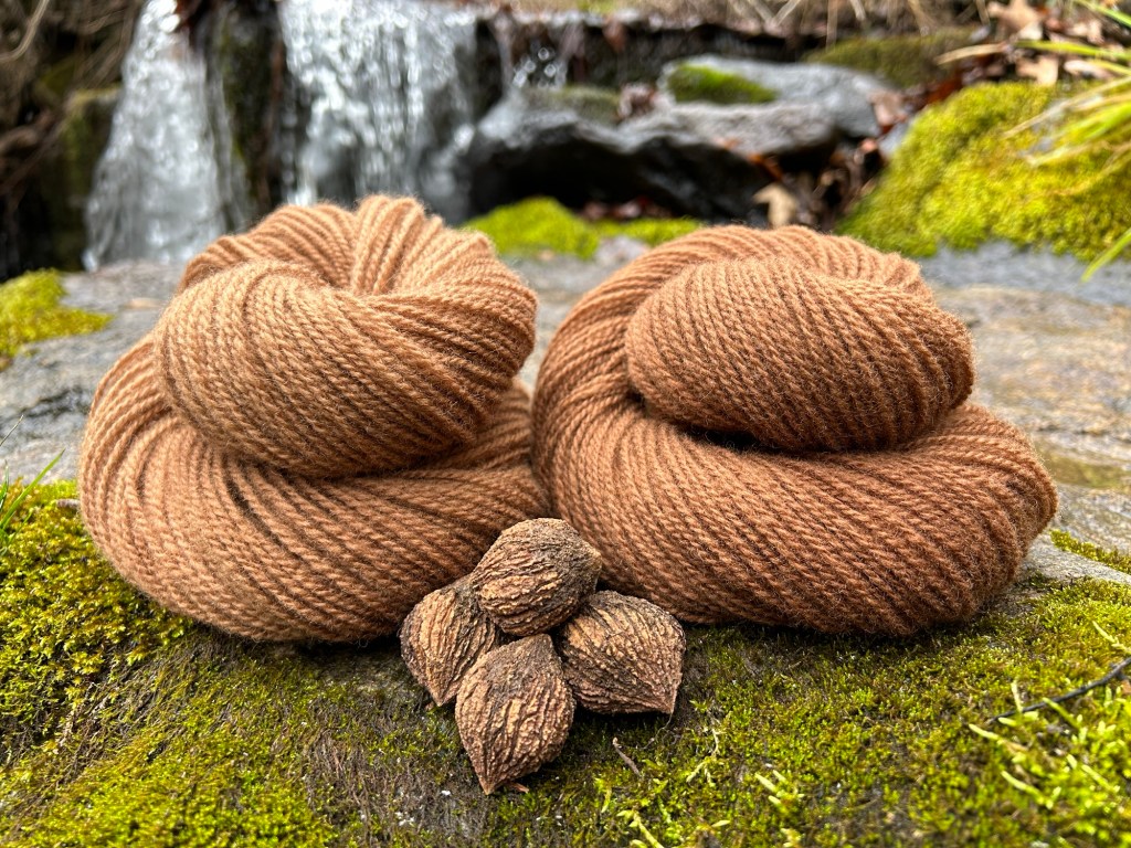 I tried two different yarn bases, and for each I dyed one skein with just the black walnut hull (left), and then added iron as a modifier to the dye to see if it would darken the color (right). I had expected the iron to have a more significant effect and was hoping for a really dark, chocolatey brown. Honestly, I’m not sure why the color is so light. I used so much plant material the water was almost sludge, but the wool didn’t take the dye as well as I anticipated. All is well though, I love this medium brown and I got some nice subtle variation in color across the four skeins.