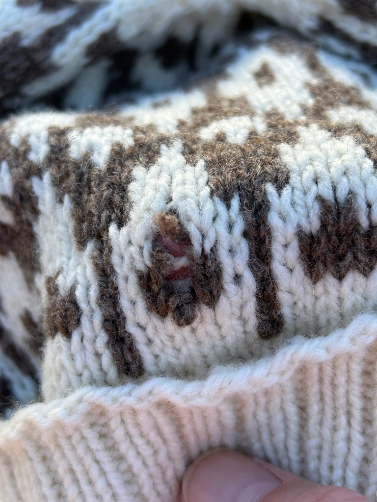 I had to rip out the collar, and the body/sleeves to below the underarms and completely reknit the top half of the sweater. That was a good opportunity to also adjust how I constructed the collar, which was previously way too wide and floppy to be functional. I finally ripped it all out in December of 2020 to re-do everything.
