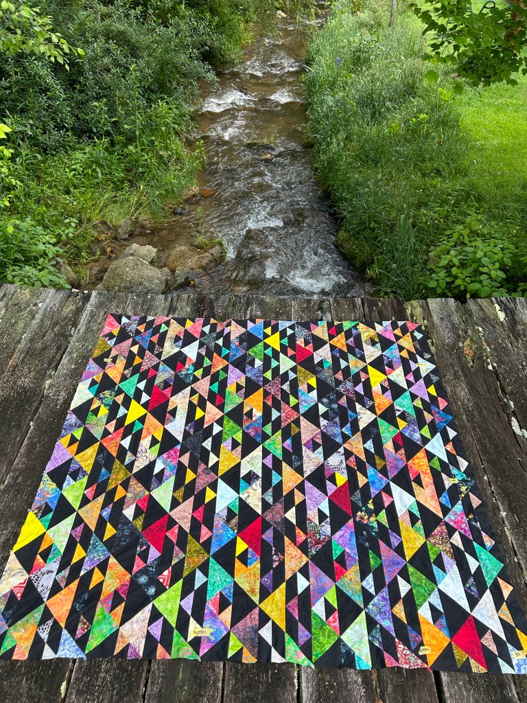 All that is left to do is put a thin black border around the entire piece, and then it will be ready to sandwich together with the batting and backing fabric. I had sewn one side of the black border on, but in my haste had chosen not to measure or use pins and – wouldn’t you know it – by the time I got to the other end of the quilt I was about 6 inches short. At that point it was nearly midnight on my last day of vacation and after ripping that strip of fabric off the quilt top in disgust at my own mistake, I haven’t worked on it since. I hope to pick it up again soon to finish the top and get started on the quilting. Mistake aside, I really love how it turned out! There are so many different colors and patterns, I tried to let go of control and allow the pieces to come together however they were meant to. Of course, being fully incapable of relinquishing all control, I did my best to make sure that the same color/pattern wasn’t butting up against itself. I think I succeeded pretty well.