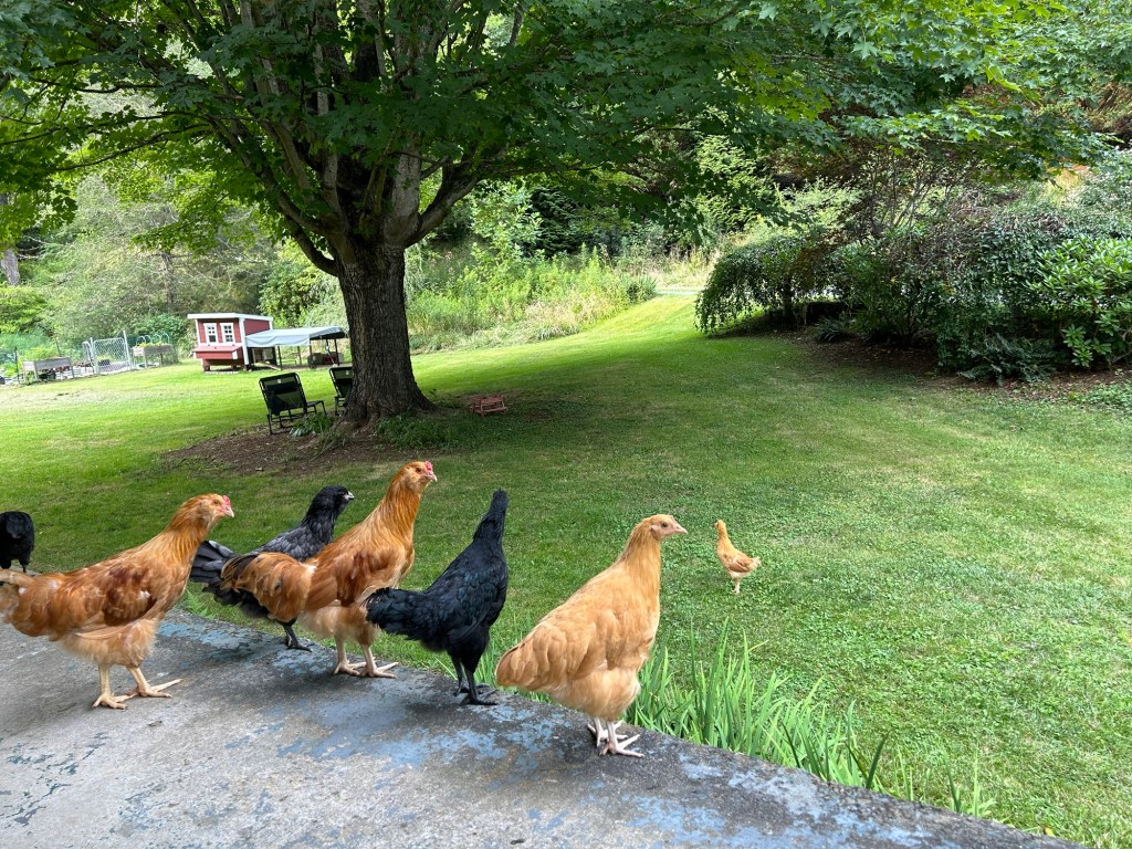 DJ Nuggie (named by my wonderful stepkid, naturally) started out mostly black but as she grows her feathers are becoming more gray with black edges. This photo is from a few weeks ago, and she’s even more gray now. She’s really pretty and I’m glad they’re all getting along. It took a few weeks to establish the pecking order, but the squabbles have calmed down now.