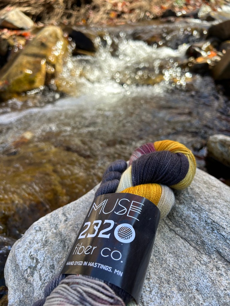 This will be the perfect thing to wrap around my neck on chilly days for a bit of comfort. I started knitting this in September just to have something mindless on hand to work on in the evenings, but it turned into the perfect project to knit by the light of a headlamp during the week we were without power after Helene. Simple enough that I didn’t have to pay attention, but it still gave me something to do with my hands other than constantly wringing them with stress and anxiety. So this now officially makes TWO finished knitting projects for 2024, and I’m not stopping there. After I wrapped up this project, I decided it was time to knit Kyle what seems to be turning into his annual pair of socks. I went diving into my stash of sock yarn and came out with this beautiful hand-dyed skein from Muse 2320 Fiber Co. that I bought from The Yarnery about a year and a half ago. (At least I’m assuming that I bought it from the Yarnery because their email marketing always gets me and I rarely buy yarn from anywhere else, though they don’t have it available on their website anymore.)