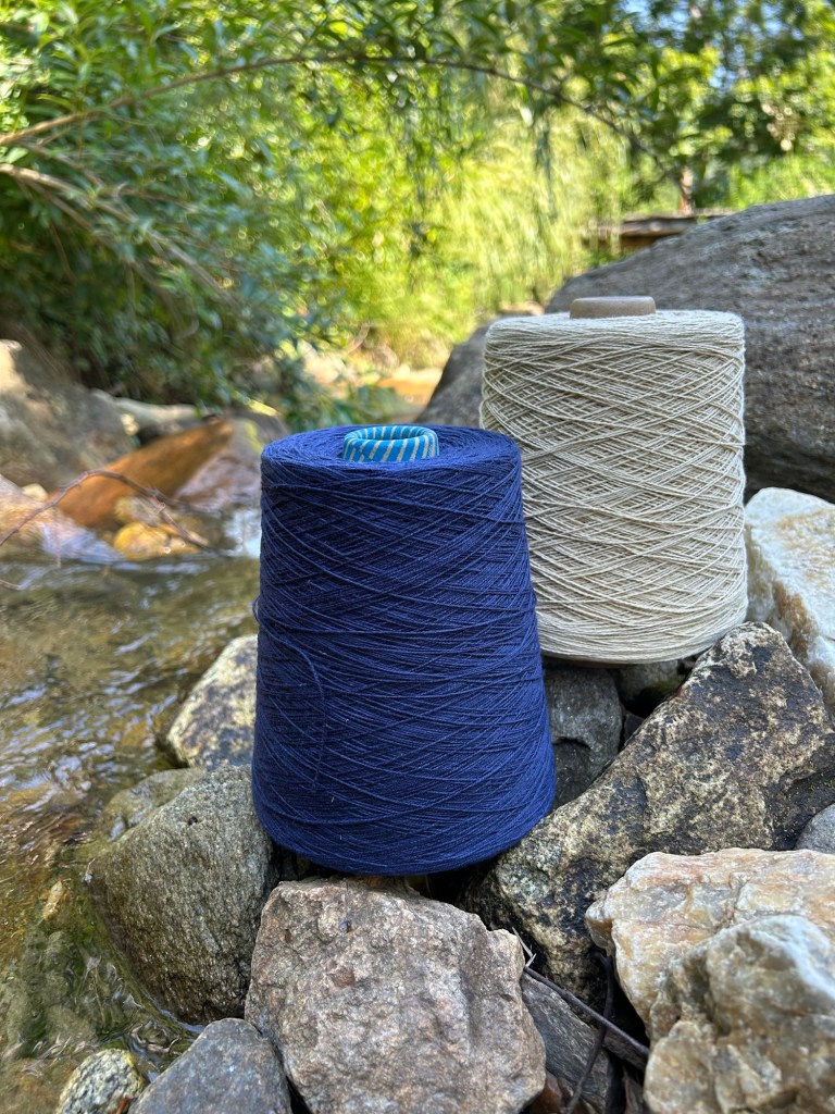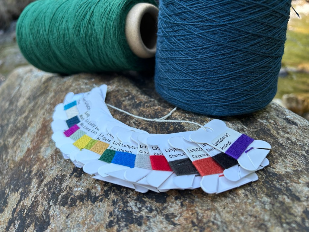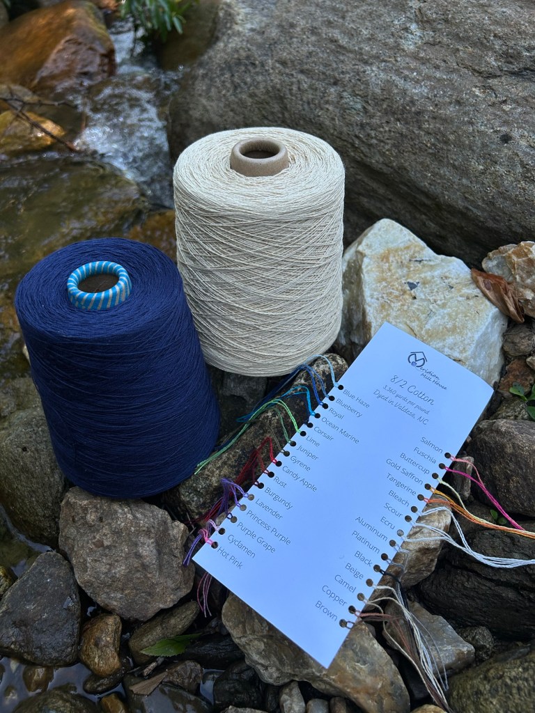 The first is from Meridian Mill House. This company specializes in domestically-sourced natural fibers and I was shocked to learn that all of their yarn is spun in Ranlo, NC. The cotton itself is sourced from eastern US/Memphis area and once spun, it is dyed in Valdese, NC – just 74 miles away. I love that the yarn production is so close to home. The only downsides are that it comes in a limited color range (see color card below) and that it is only sold in 1-pound cones, so there would be some work involved in splitting it into smaller packages for sectional beaming. Neither of these are deal breakers and if, after sampling, I find that this is a superior product I will find a way to work around those limitations.