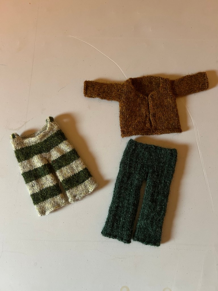 I got close. I got so close. Their bodies are done, I closed up the seams, wove in the ends, dealt with any gaps in the meticulously-shaped joints to prevent stuffing from poking out. But do you know what ultimately did me in? The eyeballs. I have to crochet a tiny little circle and then hand-stitch the details onto the eyeball before cutting a hole into the head of the frog/toad, picking up stitches, knitting eyelids, and then somehow masterfully sewing the eye into place without making him look lopsided or cross-eyed. I made eight eyeballs – I only need four. Some didn’t make the cut. I still may need to make more. I tried sewing one in and immediately took it out because despite how it looked, I am not trying to make haunted dolls that come alive at night. So I took a break and moved on to the clothing.
