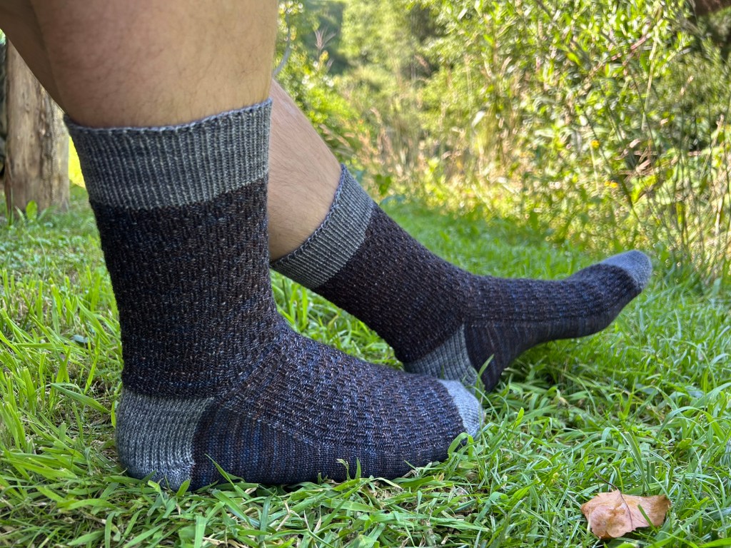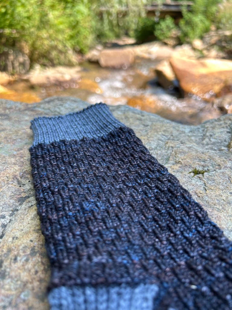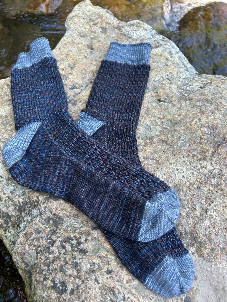 I didn’t actually do any knitting while we had guests, but at least I was reminded of this project and was able to pick it up again last month. Usually my record-keeping is much better, but I also don’t have any documentation of when I finished the second sock. I do, however, know that the yarn is Tosh Sock in the colorway “Mare” (sea, not horse, glad I got that sorted out) from my deep stash and I used Charcoal as the contrasting toe/heel/cuff. The pattern is the exact opposite of a pair of socks I made for Kyle last year. As I was knitting his socks, I was pleasantly surprised that I liked the inside of his socks as much as the outside, so I thought I would flip it around and use the stitch pattern again for myself.